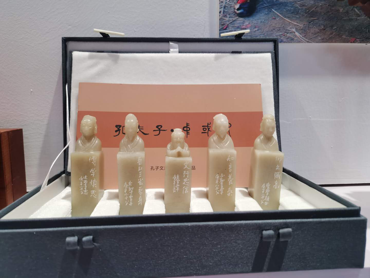 此次會展,濟(jì)寧孔子文旅集團(tuán)帶來了五大圣人印、大漆茶具“流動”等幾十種文創(chuàng)產(chǎn)品,吸引了現(xiàn)場觀眾的眼球,各地展商表現(xiàn)出濃厚興趣。“五大圣人”系列印章將儒家文化代表人物和印石篆刻相結(jié)合,是展現(xiàn)孔子、孟子、曾子、子思子、顏回五大圣人形象的系列印石文化作品。印章以五大圣人形象進(jìn)行設(shè)計,印身及印面篆刻《論語》等經(jīng)典語錄,選用上好丹東石為原材料,石色青白,質(zhì)感細(xì)膩溫潤,取意“謙謙君子,溫潤如玉”。紫袍孔子印章,運用巧雕藝術(shù),匠心獨具,至圣先師形象頗具神韻。此產(chǎn)品曾榮獲第四屆“創(chuàng)意濟(jì)寧”文化產(chǎn)品設(shè)計大賽暨首屆“孔子文旅杯”游客最喜愛的文化旅游產(chǎn)品評選活動金獎,并被評為2019山東省精品旅游傳播大獎十大旅游文創(chuàng)產(chǎn)品。