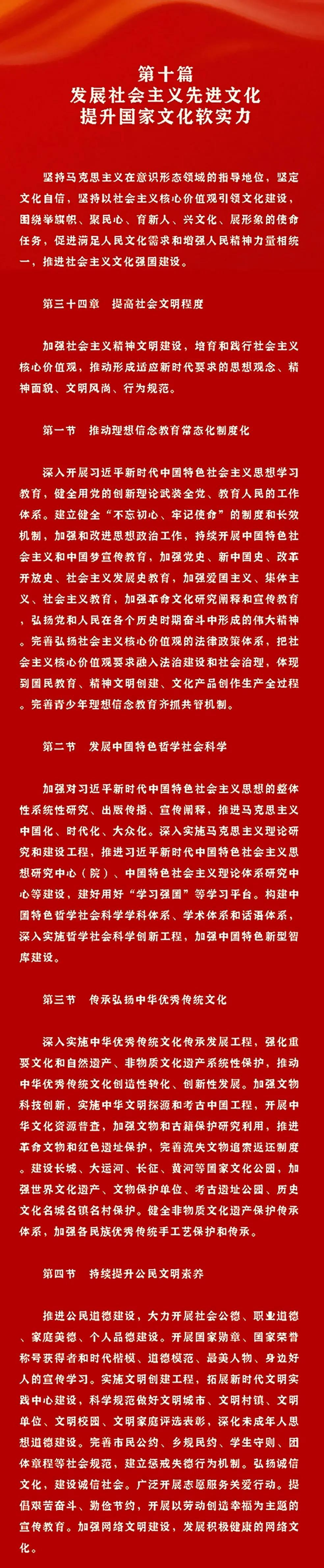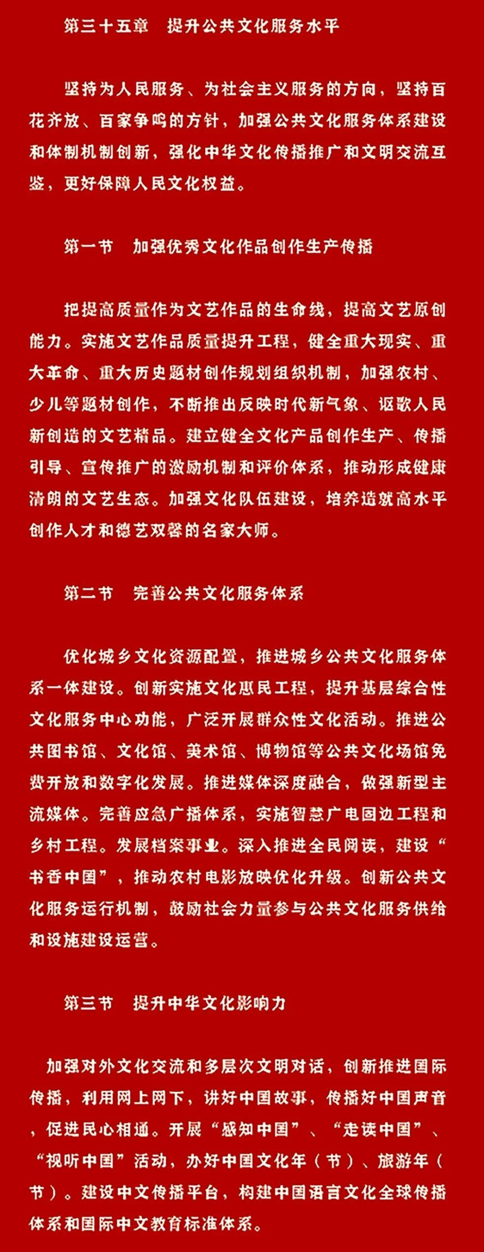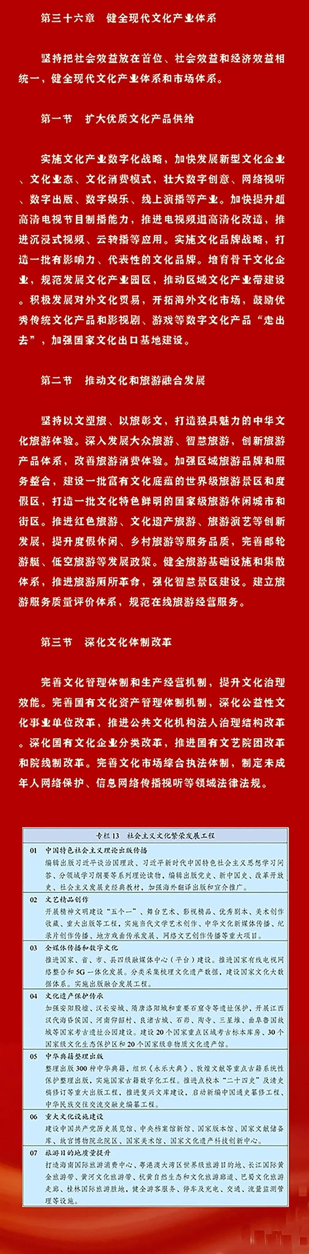 新華社3月12日全文播發(fā)了十三屆全國(guó)人大四次會(huì)議批準(zhǔn)的《中華人民共和國(guó)國(guó)民經(jīng)濟(jì)和社會(huì)發(fā)展第十四個(gè)五年規(guī)劃和2035年遠(yuǎn)景目標(biāo)綱要》。“十四五”規(guī)劃和2035年遠(yuǎn)景目標(biāo)綱要在“2035年遠(yuǎn)景目標(biāo)”部分明確提出,建成文化強(qiáng)國(guó)、教育強(qiáng)國(guó)、人才強(qiáng)國(guó)、體育強(qiáng)國(guó)、健康中國(guó),國(guó)民素質(zhì)和社會(huì)文明程度達(dá)到新高度,國(guó)家文化軟實(shí)力顯著增強(qiáng)。在第十篇《發(fā)展社會(huì)主義先進(jìn)文化 提升國(guó)家文化軟實(shí)力》中,對(duì)推進(jìn)社會(huì)主義文化強(qiáng)國(guó)建設(shè)作出具體規(guī)劃,具體內(nèi)容如下。