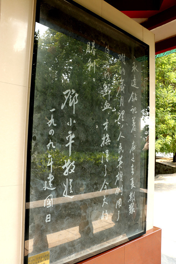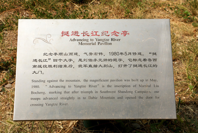 4、挺進長江亭:位于劉鄧雕塑的東側(cè),建于1980年5月,意示魯西南戰(zhàn)役的勝利打開了挺進長江的大門,“挺進長江”為劉元帥題字。