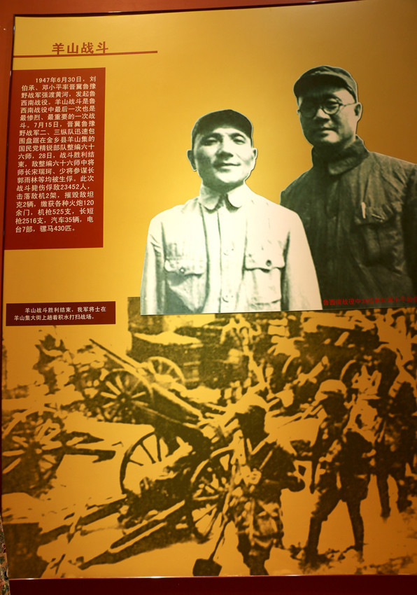 1947年,劉鄧大軍率領(lǐng)晉冀魯豫野戰(zhàn)軍挺進魯西南地區(qū),發(fā)動了著名的魯西南戰(zhàn)役,其中羊山戰(zhàn)役是魯西南戰(zhàn)役中最為關(guān)鍵、最為慘烈的一場戰(zhàn)斗。魯西南戰(zhàn)役的勝利為人民解放軍挺進中原,躍進大別山,把戰(zhàn)爭引向國統(tǒng)區(qū)開辟了道路,揭開了中國人民解放軍從戰(zhàn)略防御轉(zhuǎn)入戰(zhàn)略進攻的序幕。使中國人民解放戰(zhàn)爭從此開始了一個偉大轉(zhuǎn)折,為奪取全國勝利創(chuàng)造了有利條件。魯西南戰(zhàn)役紀念園就是在羊山戰(zhàn)役遺址的基礎(chǔ)上,以紅色旅游為主,建有劉鄧雕塑、魯西南戰(zhàn)役紀念館、烈士公墓、碑廊、兵器園,以及王杰紀念館等。