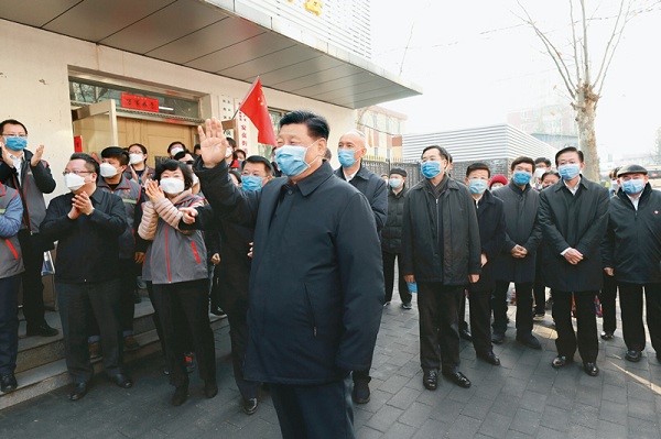 2020年2月10日,中共中央總書記、國家主席、中央軍委主席習近平在北京調研指導新冠肺炎疫情防控工作。這是習近平來到朝陽區(qū)安貞街道安華里社區(qū),了解基層一線疫情聯防聯控情況。 新華社記者 鞠鵬/攝